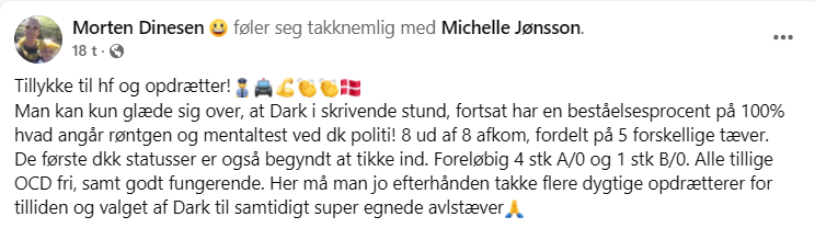 - Helse: Røntgenresultater og mentaltester utført av dansk politi viser en 100 % beståelsesprosent for hans avkom, med 8 av 8 valper (fra 5 ulike tisper) godkjent av Dansk politi.